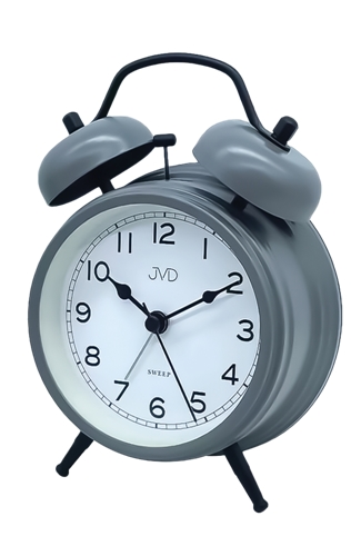 Ručkový budík JVD sweep s tradičním kovovým designem a tichým chodem.