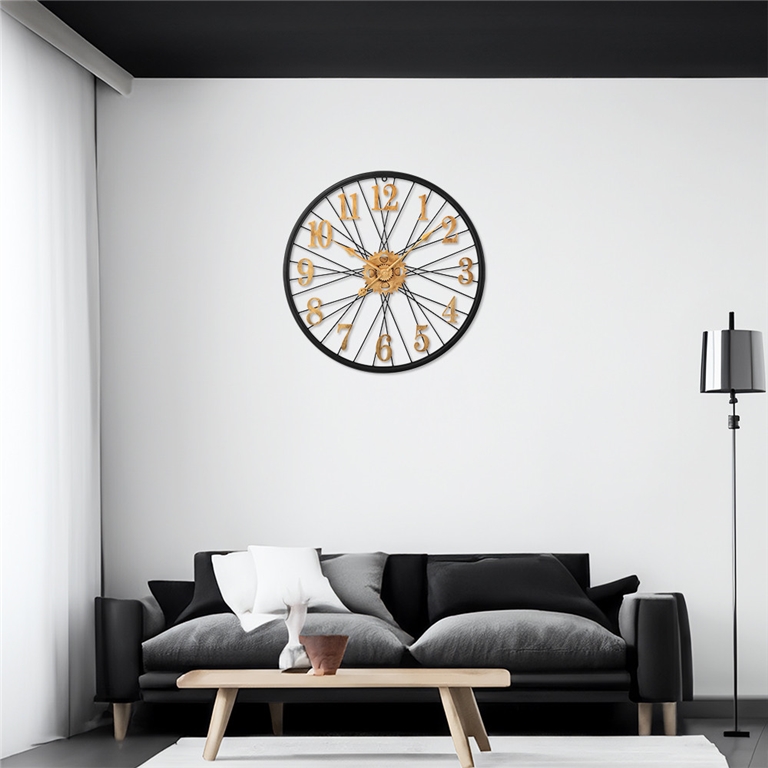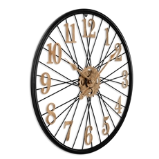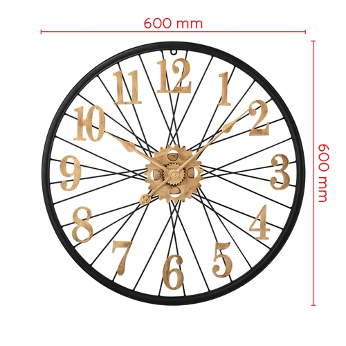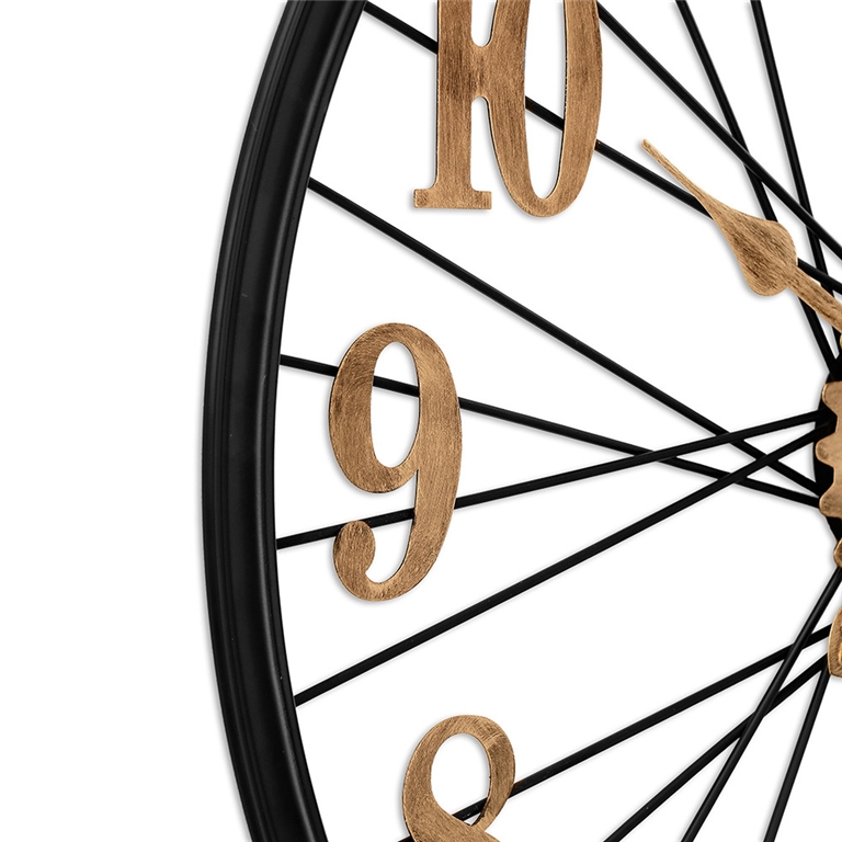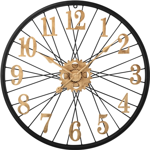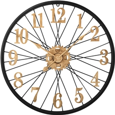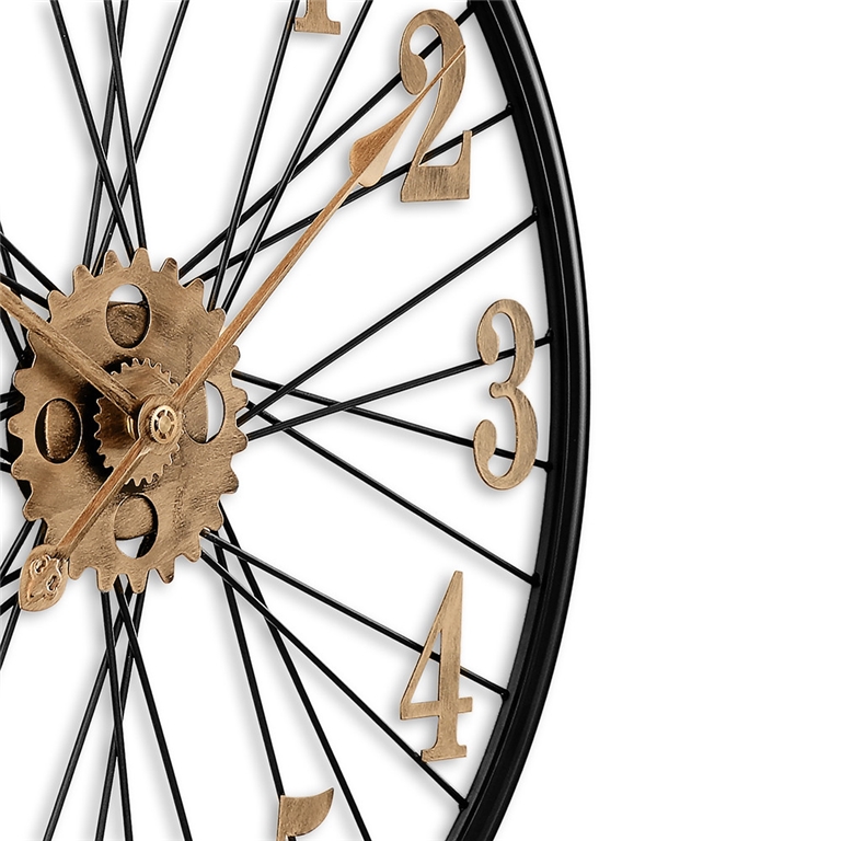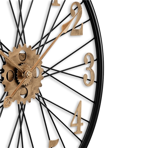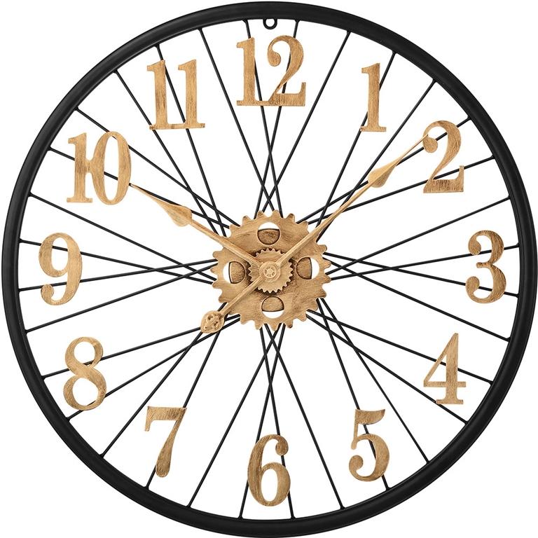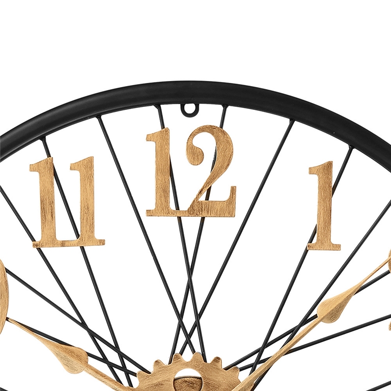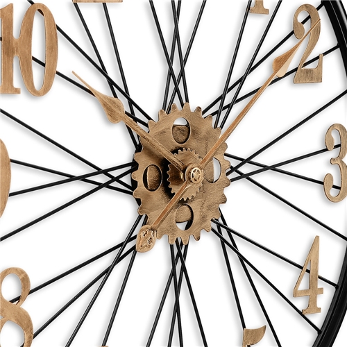 Designové kovové hodiny o průměru 60 cm nadchne každého příznivce vintage stylu. Působivý propletený číselník, vycházející jako by z kola velocipédu, doplňují výrazné antické arabské číslice a ozubená kolečka, vše ve zlatém patinovém vzoru na jinak černém rámu hodin.