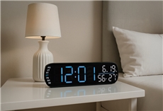 Digitální budík JVD napájený adaptérem ze sítě s kalendářem a teploměr.