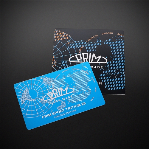 Sportovní pánské hodinky s číselníkem osazeným speciálními kapilárami plněnými tritiem (T25), vyrobenými ve Švýcarsku, jež jsou upevněny v hodinových indexech a ručičkách. V případě PRIM Sport Tritium 25 – World Timer jsou kapiláry v kombinaci oranžové na pozici 12 hodin a zelené na ostatních indexech.