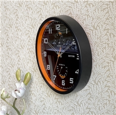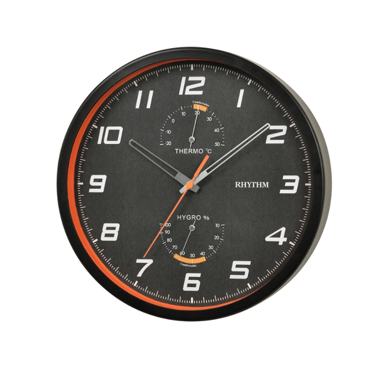 Nástěnné hodiny značky Rhythm s teploměrem a vlhkoměrem, plynulý chod bez tikání