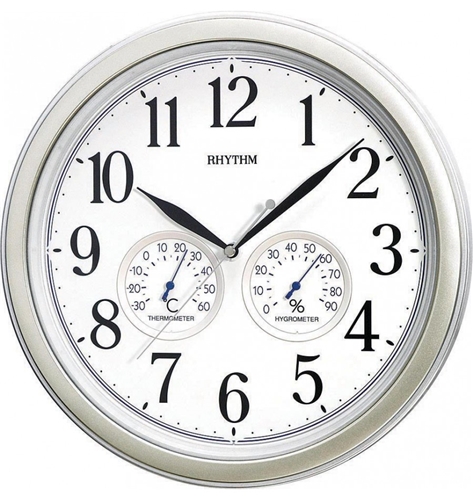 Nástěnné hodiny značky Rhythm s teploměrem a vlhkoměrem, plynulý chod bez tikání