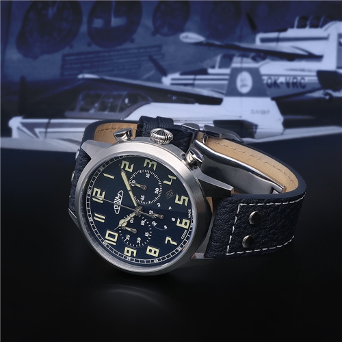 Pilotské výrazné dynamické prvky jsou patrné na přední straně propracovaného číselníku. Pilot ručky a indexy jsou pokryté super lumini vrstvou a umožňují tak odpočet času při snížené viditelnosti. Hodinky jsou vybaveny kvalitním antireflexním safírovým sklem. Voděodolnost 10 ATM zaručuje vysokou odolnost i pro náročné zákazníky. Hodinky jsou sladěny s koženým řemínkem s tradičními cvoky a doplněným dvojitou sponou s tzv. motýlkem. Limitované edice je vyrobená pouze v 50 ks. Tyto luxusní hodinky jsou dodávány spolu s certifikátem a záručním listem ve speciální krabičce. Pokud tak milujete letectví a nebo hledáte nadčasový funkční design, hodinky jsou vyrobeny právě pro vás.