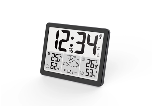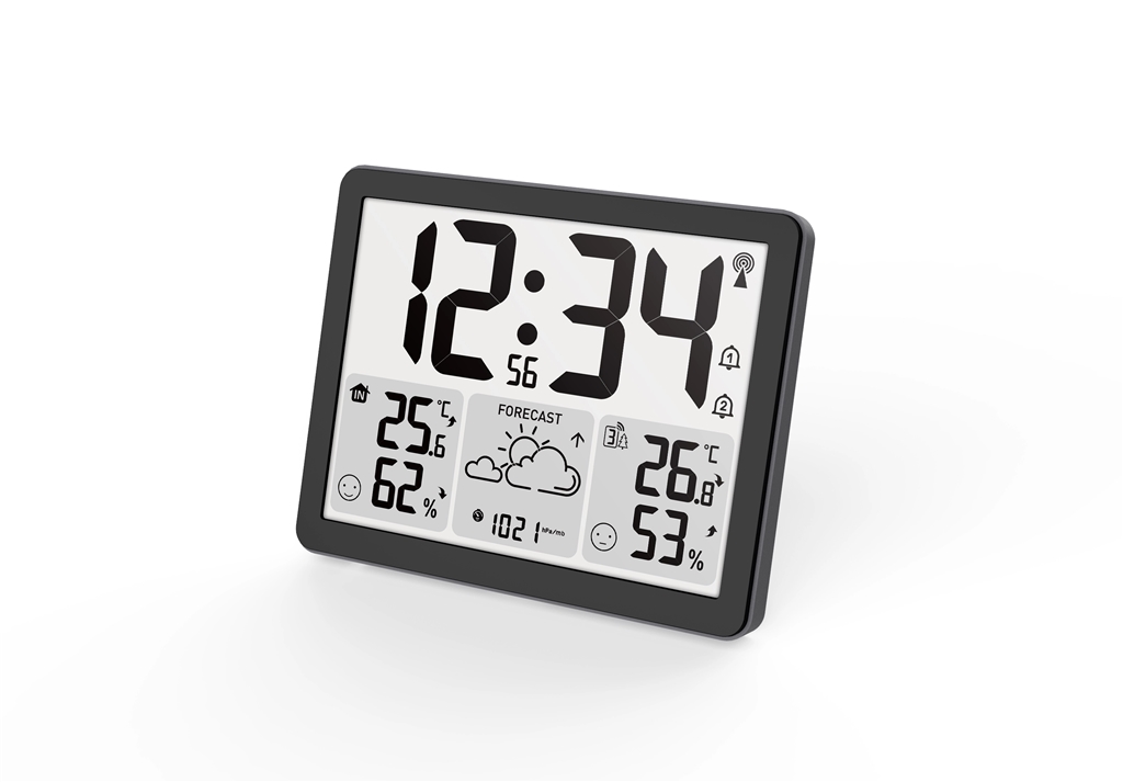 Meteorologická stanice s LCD displejem s časem řízeným rádiovým signálem DCF-77, budíkem, měřením vnitřní teploty a vzdušné vlhkosti, bezdrátovým čidlem pro měření vnější teploty a relativní vlhkosti