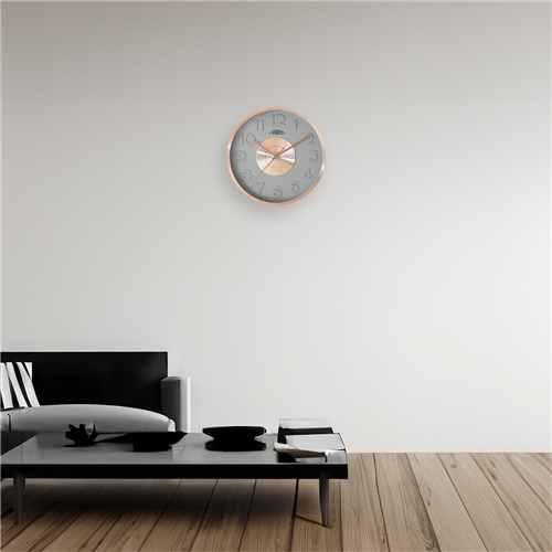 Designové nástěnné hodiny PRIM Sensation o průměru 296 mm se světelným a zvukovým senzorem v elegantním růžovém zlacení. Růžovému zlacení se nevyhnuly ani další komponenty, které perfektně doplňuje matně stříbrný číselník s plastickými arabskými číslicemi.