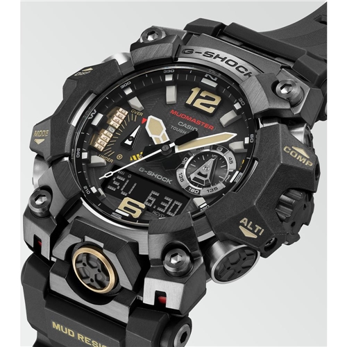 Vysoce odolné pánské hodinky Casio G-SHOCK Mudmaster Carbon Core Guard s bluetooth připojením k mobilnímu telefonu, rádiem řízené, solární napájení, s kompasem, teploměrem, výškoměrem a dalšími funkcemi..