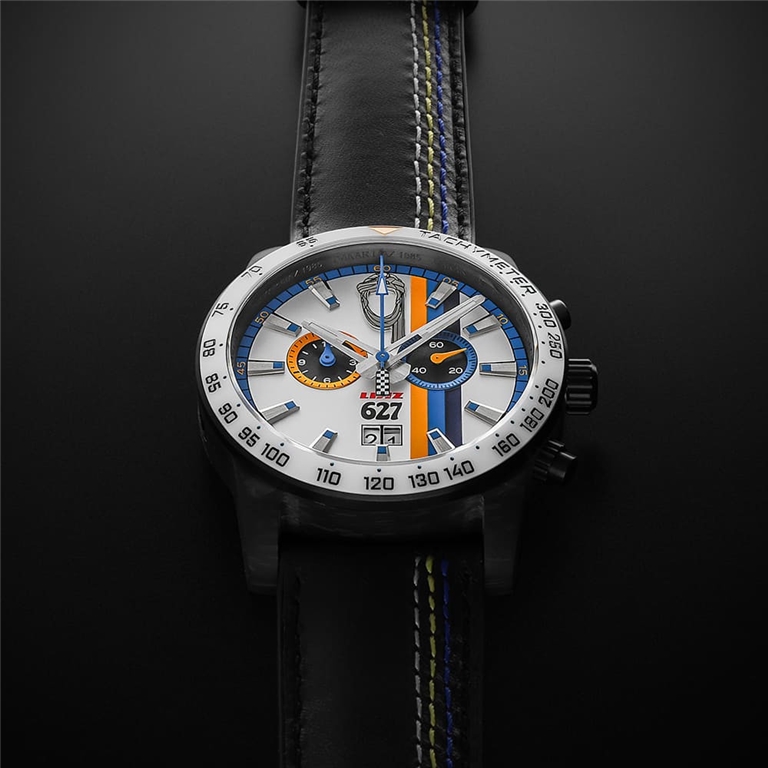 Bílý matný ciferník zdobí pruhy inspirované kamionem LIAZ, které pokračují i na FKM řemínku se stejným prošitím.