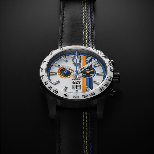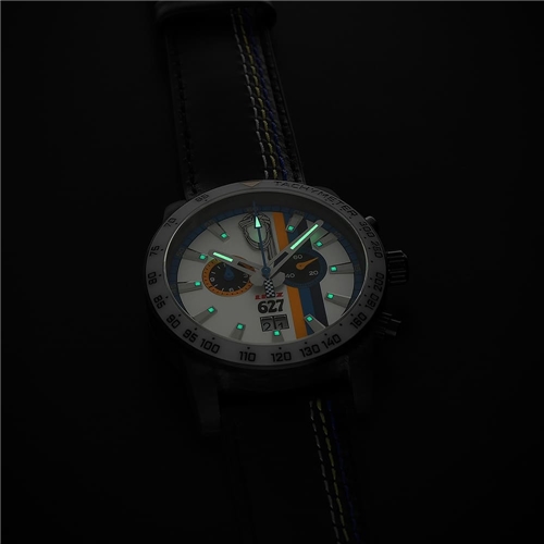 Uvnitř tiká švýcarský chronograf kalibru 5020.B, který zaručuje přesnost i v náročných podmínkách. Sportovní charakter doplňuje vodotěsnost 10 ATM a šroubovací korunka.