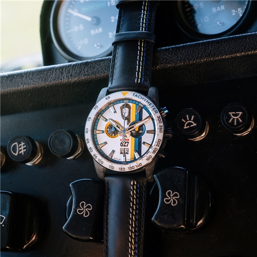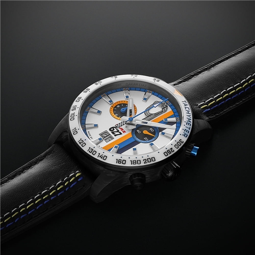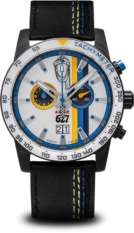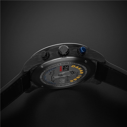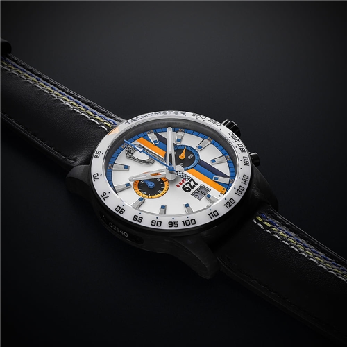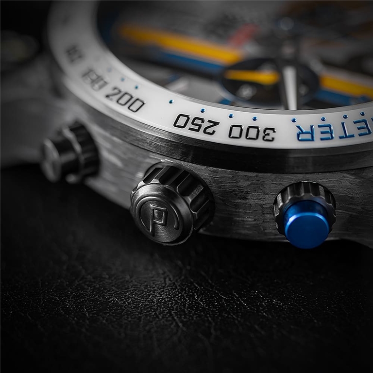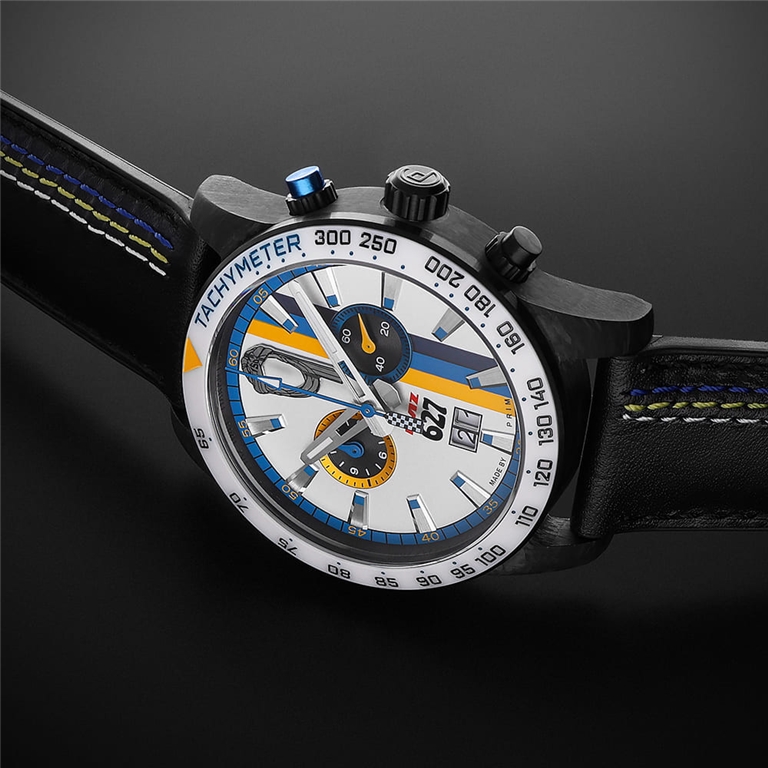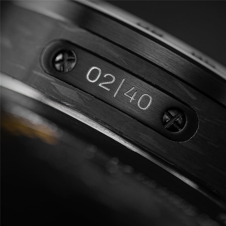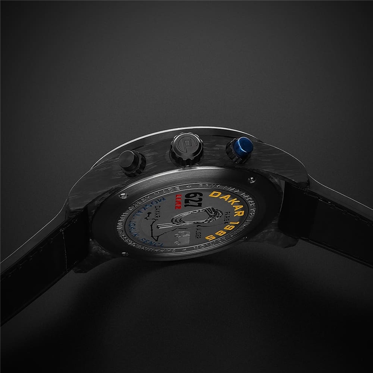 Výjimečné výročí si žádá výjimečné hodinky. Proto jsme se rozhodli použít pro pouzdro uhlíkové vlákno (karbon), materiál spojený s automobilovým a závodním světem. Každý kus je díky své struktuře naprostým originálem.