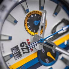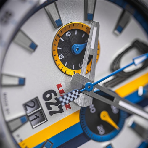 Ručičky mají broušený povrch a luminiscenční výplň, zatímco stopky chronografu zdobí šachovnicový vzor start/cíl.