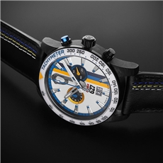 Chronografy zdobí struktura „cd“, orámovaná žlutým a modrým kontrastem.