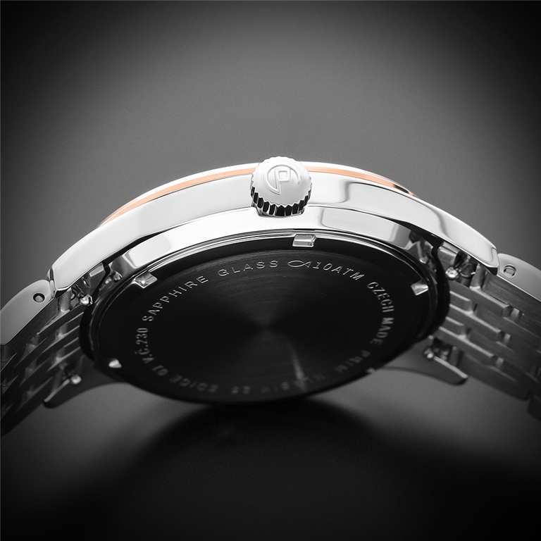 Klasické společenské hodinky PRIM Klasik 25 jsou vyrobeny z kartáčované ušlechtilé oceli 316L. Hodinky mají elegantně propracované pouzdro s decentní korunkou s logem P. Do pouzdra o velikosti 42 mm je vsazen spolehlivý japonský quartzový strojek Miyota 2305, jenž nabízí nejen vysokou kvalitu, ale i eleganci pro každodenní nošení. Hodinky mají dno z ušlechtilé nerezové oceli s popisem modelu hodinek.